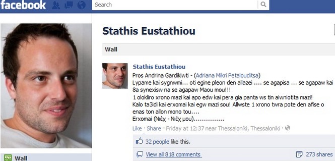 Στη συνέχεια, το κτήνος της Καστοριάς έκανε ανάρτηση στο δικό του προφίλ στο facebook με αποδέκτη την νεκρή πρώην σύντροφο του, ζητώντας της συγνώμη ένα κείμενο όπου μεταξύ άλλων έγραφε: