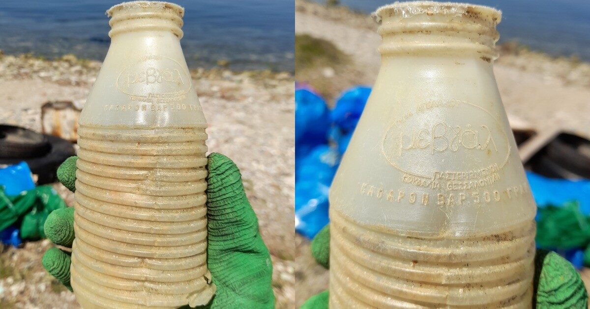 Πλαστικό μπουκάλι γάλακτος 41 ετών, εντοπίστηκε στην παραλία της Θεσσαλονίκης, από συνεργεία καθαρισμού του Δήμου.