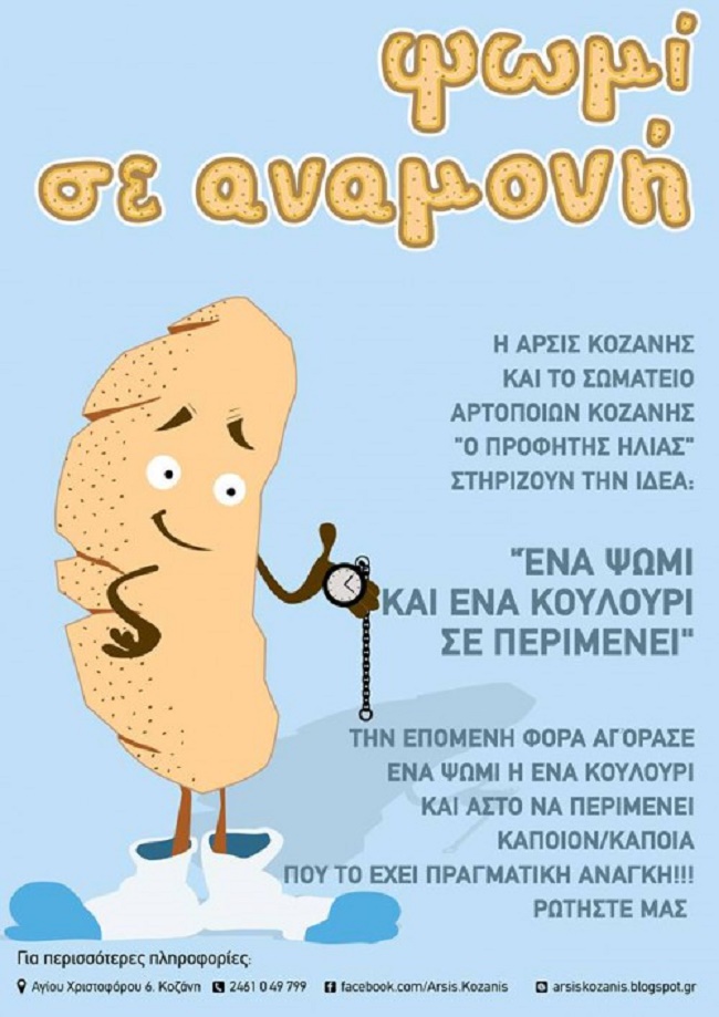 To «Ψωμί που περιμένει» είναι μια προσπάθεια ανθρωπιάς κι αλληλεγγύης, που σύμφωνα με τον υπεύθυνο της ΑΡΣΙΣ Κοζάνης, Δημήτρη Λεούδη, βρήκε συμπαραστάτες όλους τους φούρνους της πόλης. “Συμμετέχουν και οι 26 φούρνοι της Κοζάνης, με στόχο να διασφαλίσουμε διακριτικότητα και σεβασμό απέναντι σε ανθρώπους που ζουν στην ανέχεια” δήλωσε ο κ. Λεούδης.