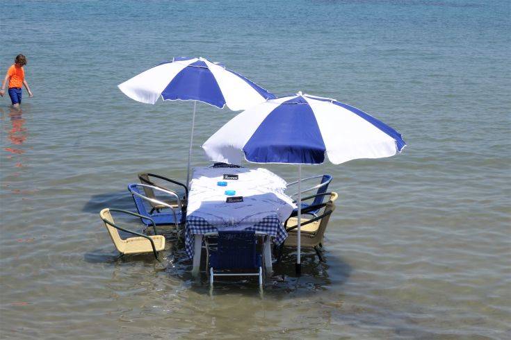 Ταβέρνα στην Κέρκυρα μετακόμισε στη θάλασσα. Έβαλε μέσα στο νερό τραπέζια, καρέκλες και ομπρέλες έτσι ώστε οι πελάτες να τρώνε και να δροσίζονται. Η ιδέα ήταν του ιδιοκτήτη της ταβέρνας για να αντιμετωπίσει τον καύσωνα και να ικανοποιήσει τους πελάτες.