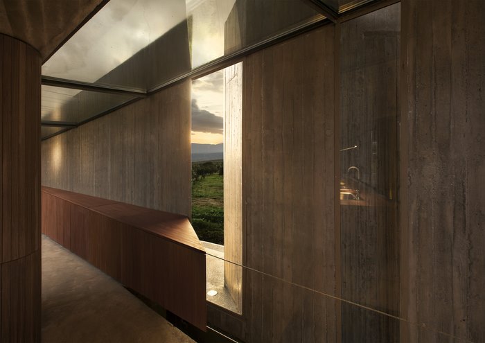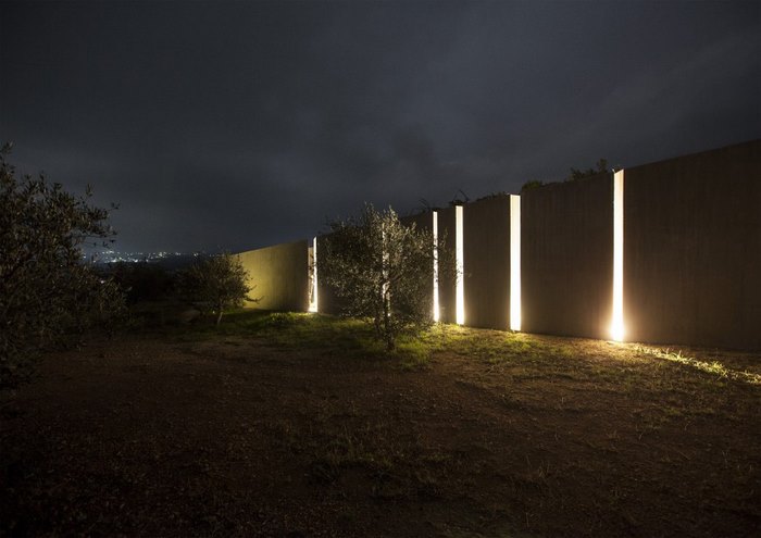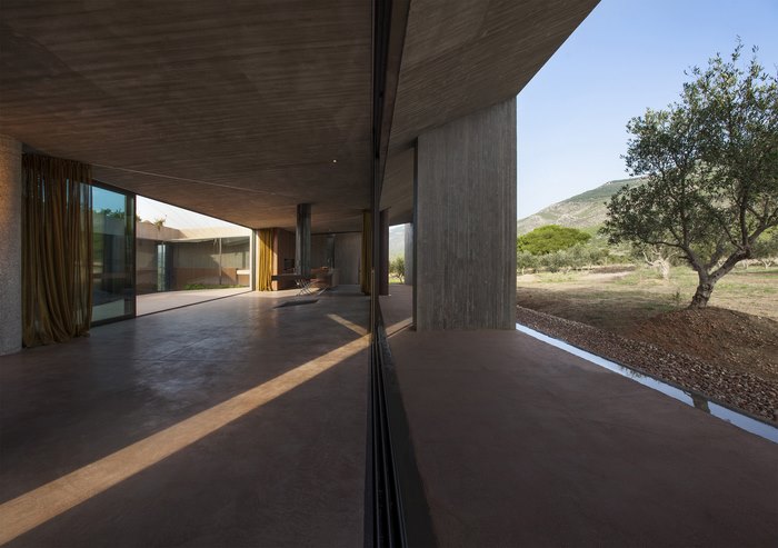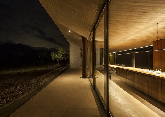 Οι ελιές χαϊδεύουν τις όψεις του, οι τοίχοι παίρνουν το χρώμα του χώματος, ο ήλιος περνά μέσα από τις σχισμές στο εσωτερικό -το σπίτι είναι ταυτόχρονα προστατευμένο και ανοικτό.