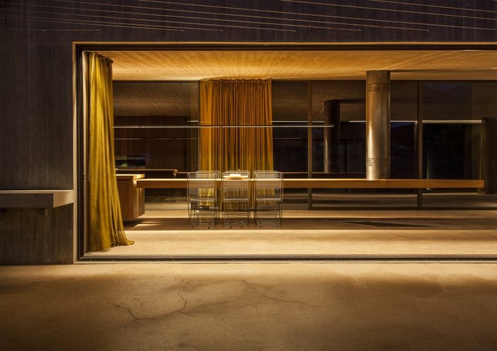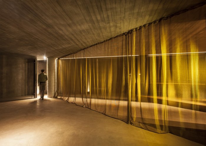 Τα ανοίγματα στους τοίχους προσφέρουν επιλεγμένες θέες στον περιβάλλοντα χώρο, ενώ λωρίδες φωτός σε αυτά φωτίζουν την πρόσοψη τη νύχτα.