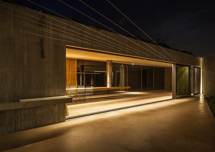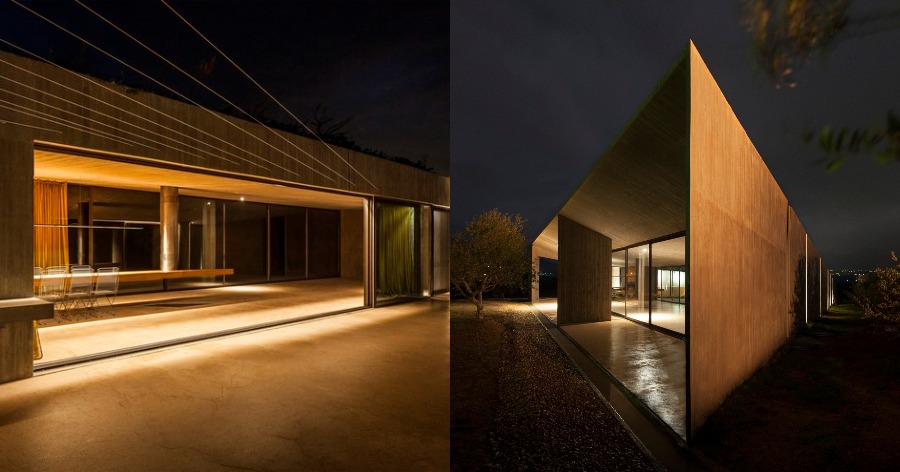 Το γραφείο Tense Architecture Network έχει δημιουργήσει λίγο έξω από την Αθήνα μια τριγωνική κατοικία από μπετόν και γυαλί. Χτισμένο σε μια απομονωμένη τοποθεσία στα Μέγαρα και με ένα λιτό, μινιμαλιστικό και αυστηρά γεωμετρικό ύφος, το κτίριο ορίζεται στις δυο πλευρές του από υαλοστάσια σε εναλλαγή με τσιμεντένιους τοίχους σε καφεκόκκινο χρώμα που εναρμονίζονται πλήρως με το φυσικό περιβάλλον.