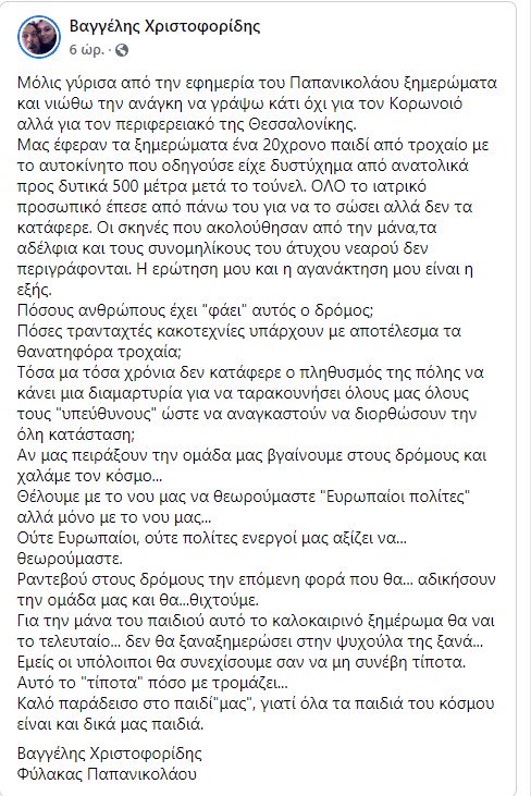 Τον πόνο και την ανησυχία για τα θανατηφόρα τροχαία στον περιφερειακό της Θεσσαλονίκης εκφράζει μέσα από τις πλατφόρμες κοινωνικής δικτύωσης ένας φύλακας του νοσοκομείου Παπανικολάου, με αφορμή το θάνατο του 20χρονου.