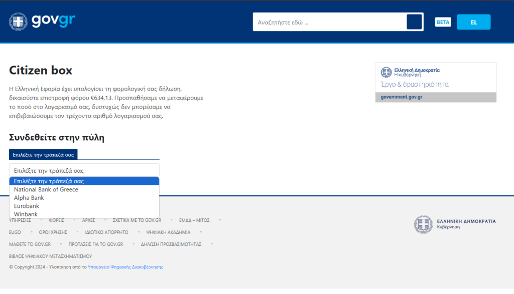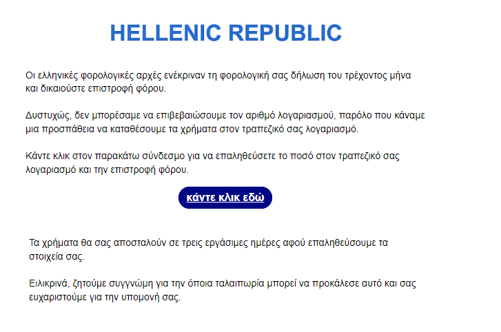 Οι ελληνικές φορολογικές αρχές αποδέχθηκαν τη φορολογική σας δήλωση για αυτόν τον μήνα και δικαιούστε επιστροφή φόρου.Αν και προσπαθήσαμε να καταθέσουμε τα χρήματα στον τραπεζικό σας λογαριασμό, δεν μπορέσαμε να επιβεβαιώσουμε τον αριθμό του λογαριασμού.Παρακαλούμε ελέγξτε τον ακόλουθο σύνδεσμο για να επαληθεύσετε το ποσό στον τραπεζικό σας λογαριασμό και την επιστροφή φόρου.