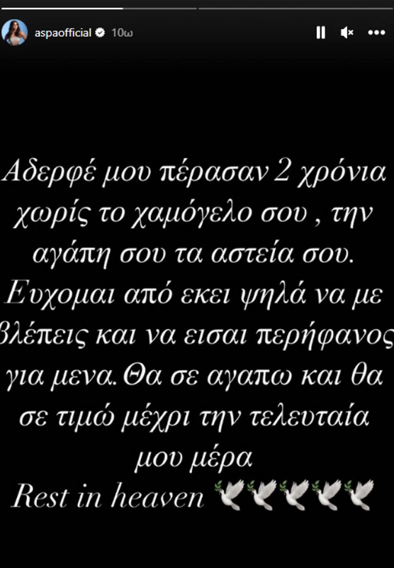 «Αδελφέ μου πέρασαν δύο χρόνια χωρίς το χαμόγελό σου, την αγάπη σου τα αστεία σου. Εύχομαι από εκεί ψηλά να με βλέπεις και να είσαι περήφανος για εμένα. Θα σε αγαπώ και θα σε τιμώ μέχρι την τελευταία μου μέρα. Αναπαύσου εν ειρήνη», ανέφερε σε μήνυμά της στο Instagram.