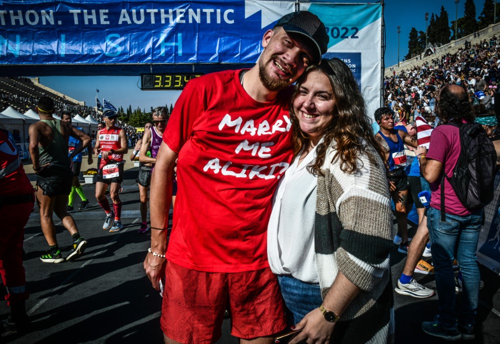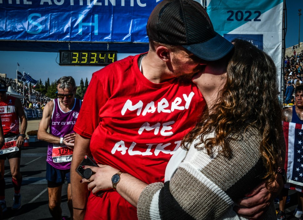 Μετά από 42 χιλιόμετρα που διέσχισε στον σημερινό 39ο Αυθεντικό Μαραθώνιο της Αθήνας, τερμάτισε και έκανε πρόταση γάμου στην αγαπημένη του.