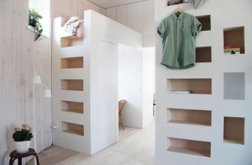 – Στο σπίτι υπάρχουν αμέτρητοι κρυφοί αποθηκευτικοί χώροι, οι οποίοι διπλασιάζονται στην πράξη, εξυπηρετώντας παράλληλα ως ράφια αλλά και σαν σκάλα για τα πάνω κρεβάτια.