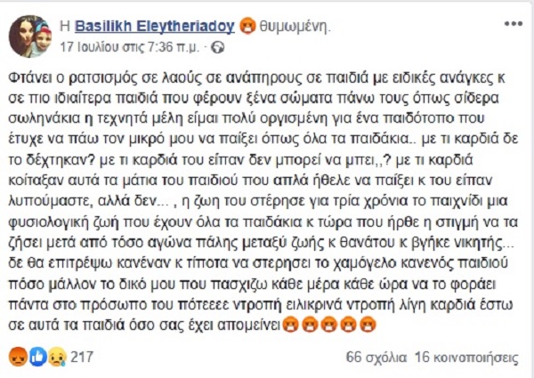 «Φτάνει ο ρατσισμός σε λαούς σε ανάπηρους σε παιδιά με ειδικές ανάγκες κ σε πιο ιδιαίτερα παιδιά που φέρουν ξένα σώματα πάνω τους όπως σίδερα, σωληνάκια ή τεχνητά μέλη είμαι πολύ οργισμένη για ένα παιδότοπο που έτυχε να πάω τον μικρό μου να παίξει όπως όλα τα παιδάκια.. με τι καρδιά δε το δέχτηκαν?