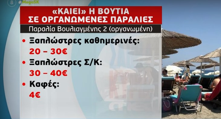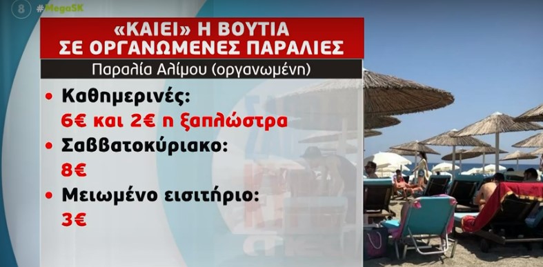 Συγκεκριμένα, όπως αναφέρθηκε σε ρεπορτάζ της εκπομπής «Σαββατοκύριακο Mega», στην παραλία του Αλίμου για την οργανωμένη οι τιμές έχουν ως εξής: