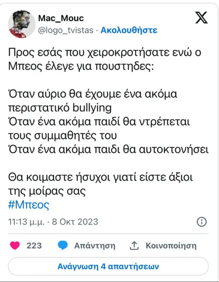 «Προς εσάς που χειροκροτήσατε ενώ ο Μπέος έλεγε για πού@@@δες: Όταν αύριο θα έχουμε ένα ακόμα περιστατικό bullying, όταν ένα ακόμα παιδί θα ντρέπεται τους συμμαθητές του, όταν ένα ακόμα παιδί αυτοκτονήσει, θα κοιμάστε ήσυχοι γιατί είστε άξιοι της μοίρας σας.