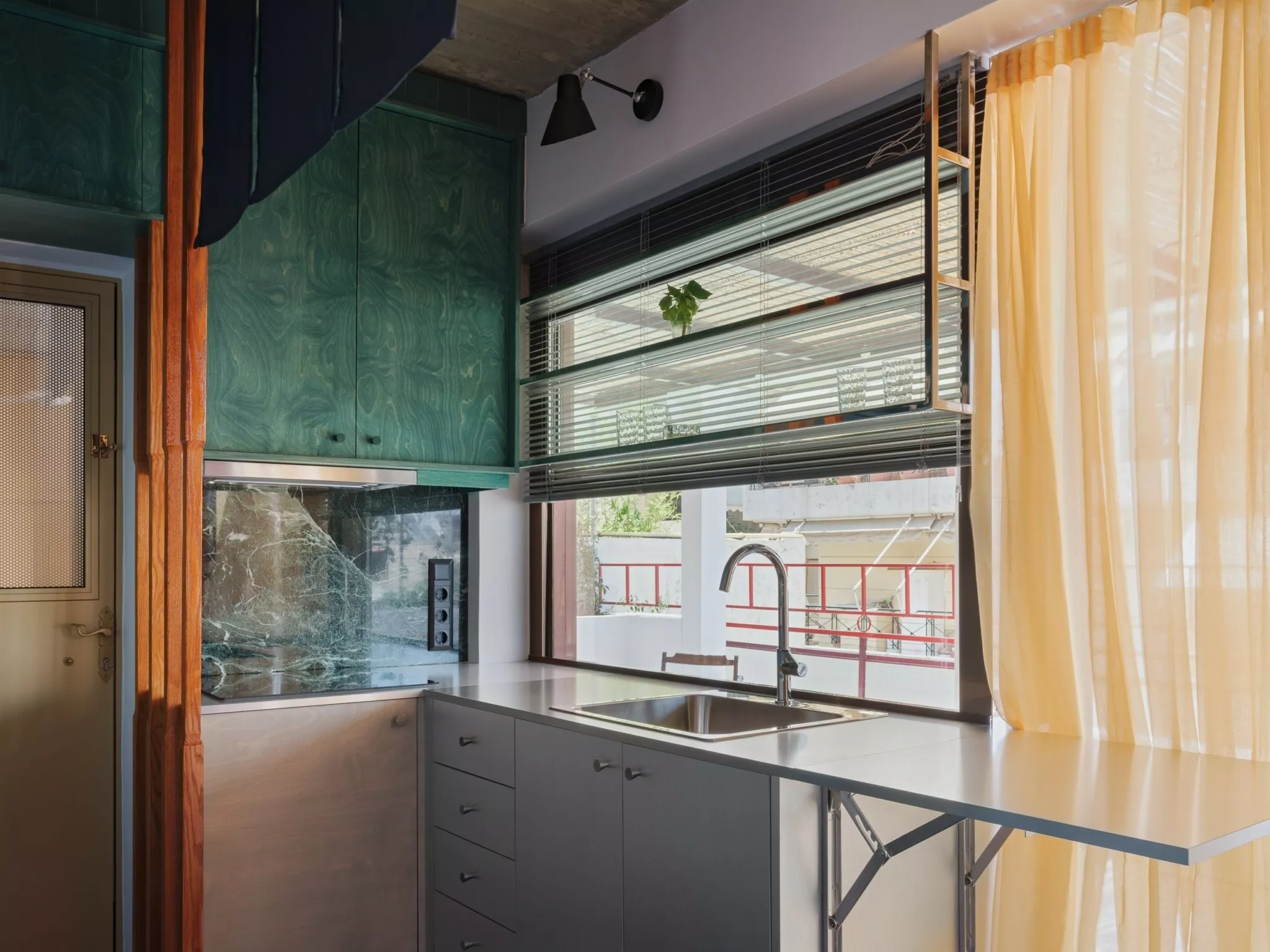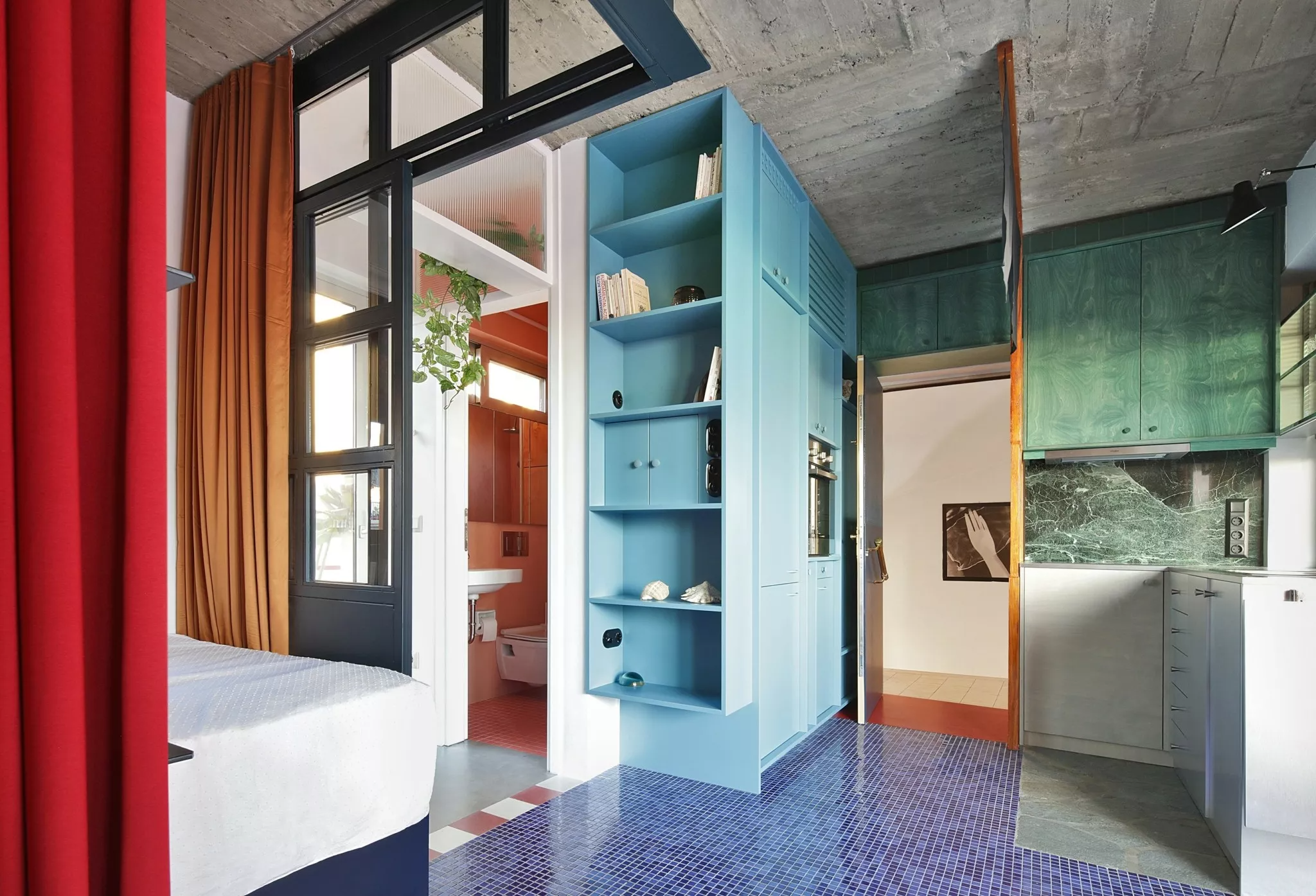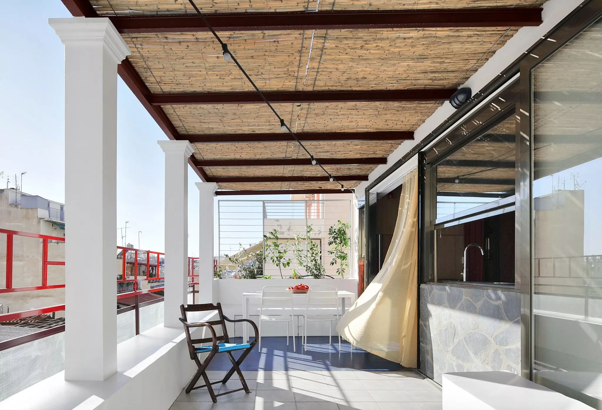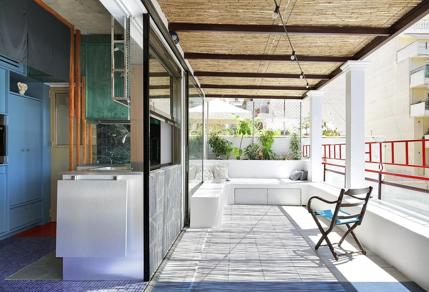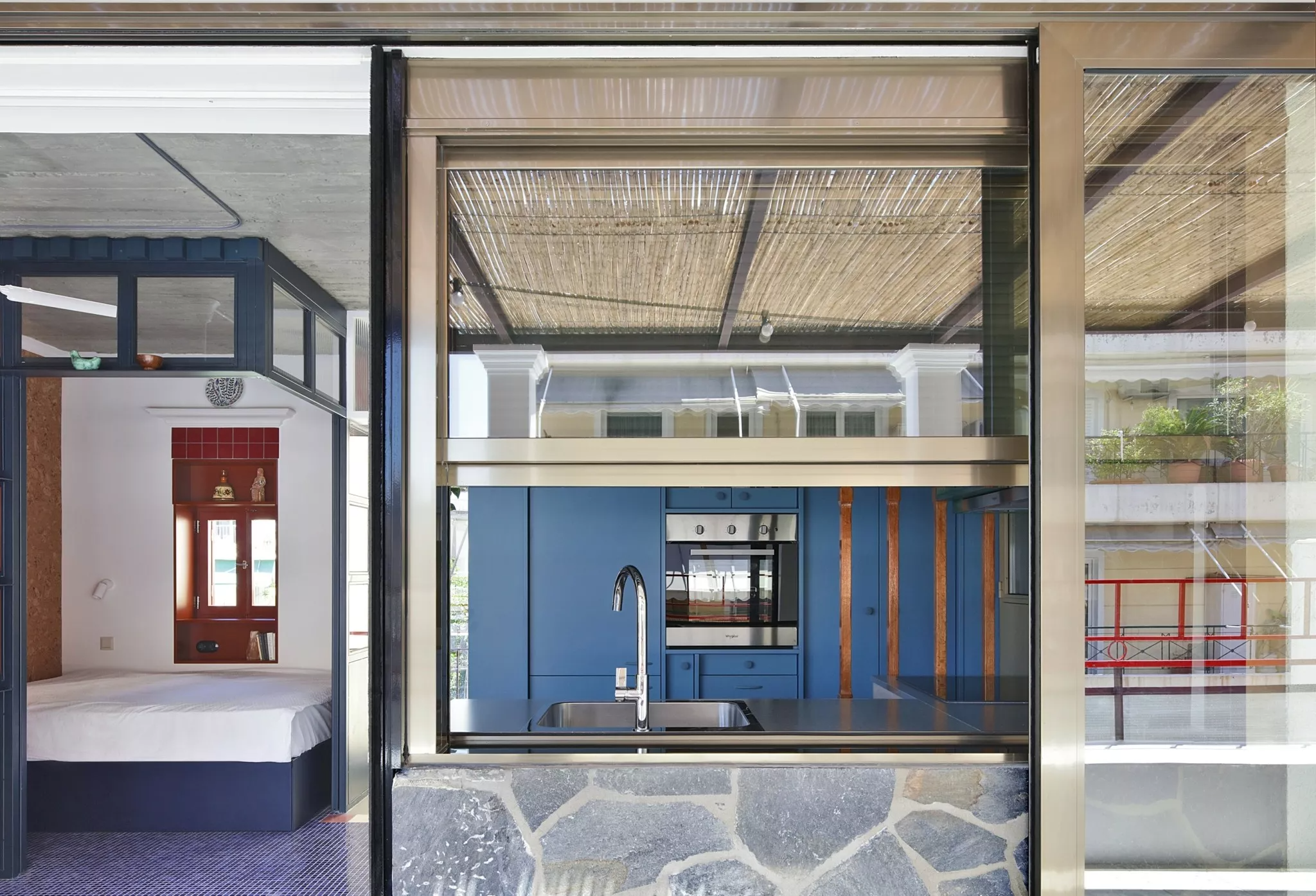 Χτίσαμε έναν πυκνό μικρόκοσμο που δημιουργεί την ψευδαίσθηση ενός χώρου δίχως τέλος. Αυτό, χάρη στις διάφορες κατασκευές, δημιουργεί υποχώρους. Ετσι, εκτός από το βασικό, σταθερό υπνοδωμάτιο, υπάρχει και ένα καθιστικό που μετατρέπεται σε δεύτερο χώρο ύπνου για δύο άτομα, με χρήση συρόμενων διαχωριστικών και κουρτινών που αγκαλιάζουν τον χώρο. Η βεράντα επίσης έχει κατασκευές που την κάνουν να μοιάζει με ένα ακόμα μεγάλο δωμάτιο. Η τζαμαρία ανάμεσα στο διαμέρισμα και τη βεράντα εξαφανίζεται, οπότε το διαμέρισμα μοιάζει να επεκτείνεται επ’ αόριστον.