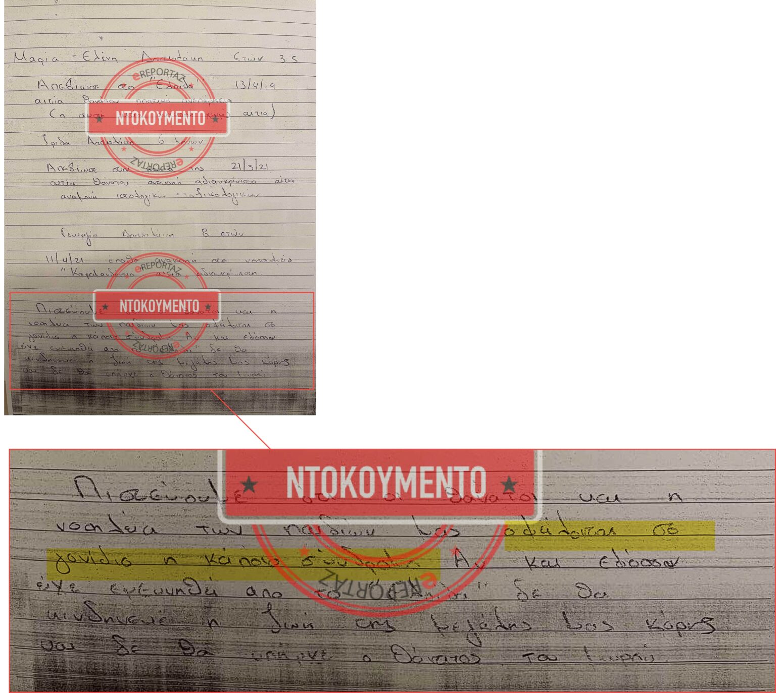 Χειρόγραφες σημειώσεις της Ρούλας Πισπιρίγκου, με τις οποίες φαίνεται πως προσπάθησε να ξεγελάσει τους γιατρούς για τον θάνατο των τριών παιδιών της έρχονται στο φως της δημοσιότητας.