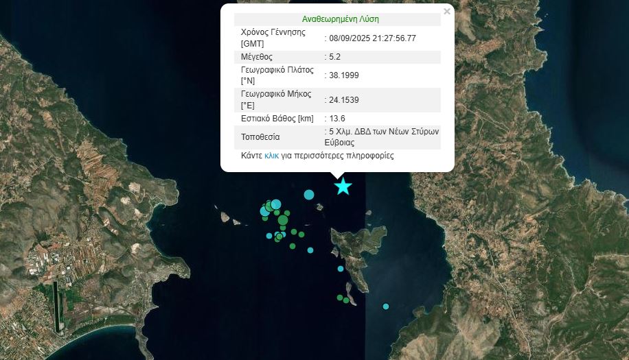 Ομαλά εξελίσσεται η μετασεισμική ακολουθία της ισχυρής δόνησης των 5,2 Ρίχτερ που καταγράφηκε στις 00:27 μετά τα μεσάνυχτα της Δευτέρας στη θαλάσσια περιοχή ανάμεσα στα Νέα Στύρα και τον Σχοινιά, και ταρακούνησε την Εύβοια και την Αττική. Ο σεισμός έγινε αισθητός σε αρκετές περιοχές της Ελλάδας και είχε μεγάλη διάρκεια.