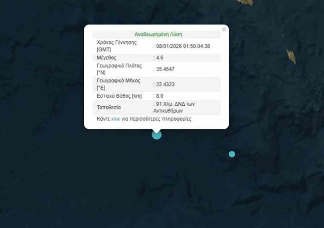 Σεισμική δόνηση 4,6 βαθμών, που χαρακτηρίζεται «ασθενής», καταγράφτηκε στις 03:50 στον θαλάσσιο χώρο ανατολικά της Κρήτης, 91 χιλιόμετρα δυτικά-νοτιοδυτικά των Αντικυθήρων, ή αλλιώς 303 χιλιόμετρα νότια-νοτιοδυτικά της πρωτεύουσας, σε βάθος περίπου 8 χιλιομέτρων, ανακοίνωσε τις πρώτες πρωινές ώρες το Γεωδυναμικό Ινστιτούτο του Εθνικού Αστεροσκοπείου της Αθήνας.