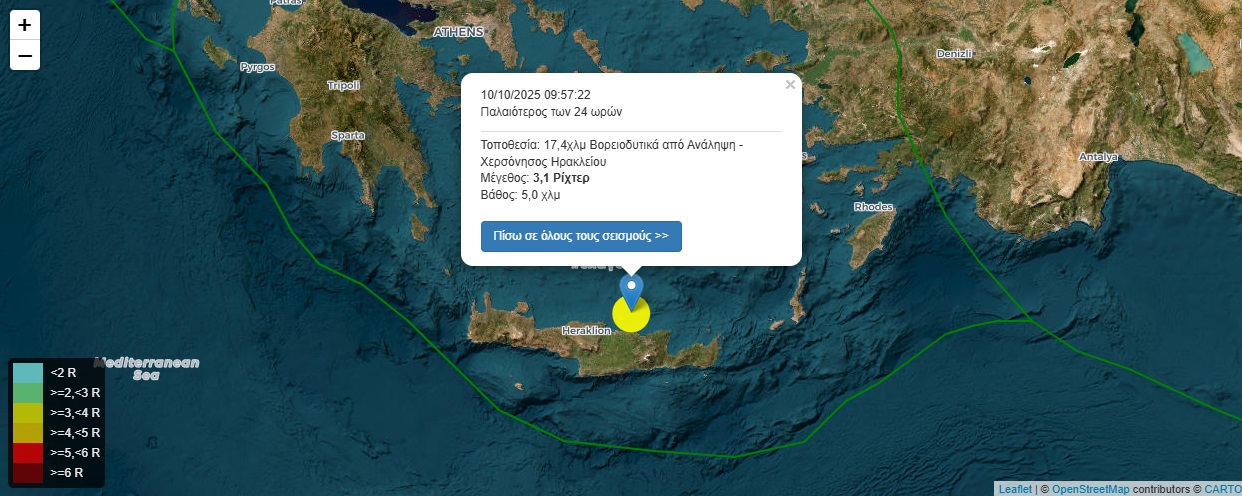 Σύμφωνα με πρώτες πληροφορίες, σεισμός 3,1 Ρίχτερ 17,4χλμ Βορειοδυτικά από Ανάληψη – Χερσόνησος Ηρακλείου στις 10/10/2025 09:57:22