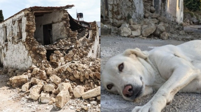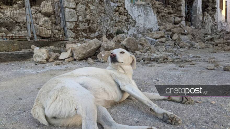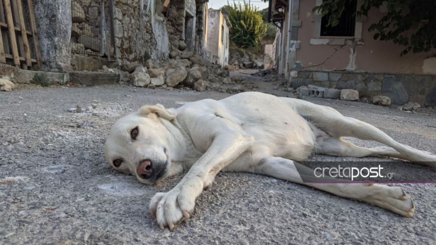 Σεισμός στην Κρήτη: Βομβαρδισμένο τοπίο θυμίζει πλέον το χωριό Χουμέρι, καθώς ισοπεδώθηκαν τα πάντα, με τους κατοίκους να το έχουν εγκαταλείψει, εκτός όμως από έναν σκύλο.