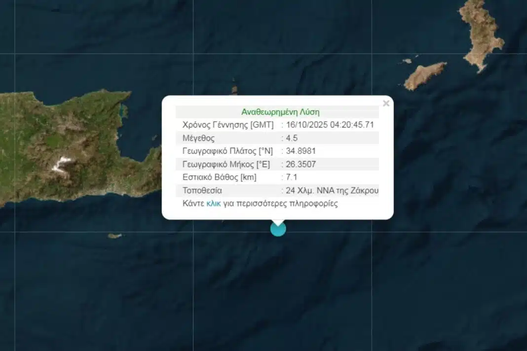 Σεισμός τώρα 4,5 Ρίχτερ σημειώθηκε νοτιοανατολικά της Κρήτης.