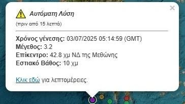 Σύμφωνα με την ενημέρωση του Γεωδυναμικού Ινστιτούτου Αθηνών, η σεισμική δόνηση σημειώθηκε 42.8 χιλιόμετρα νοτιοδυτικά της Μεθώνης.