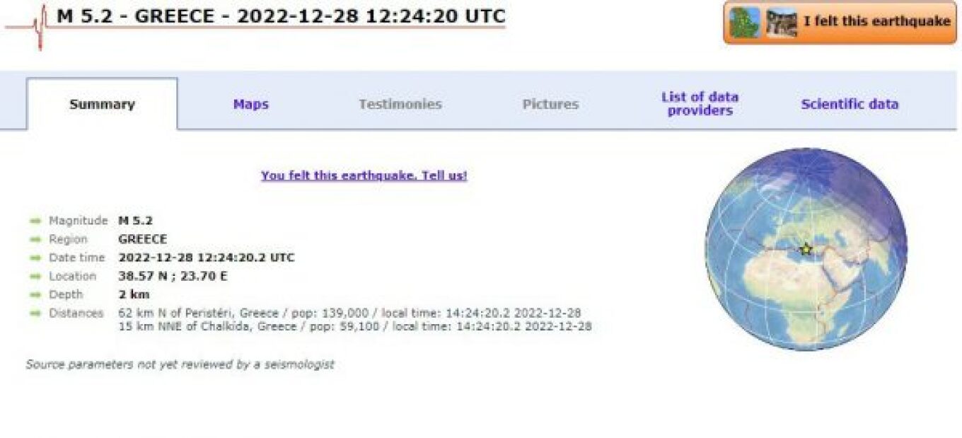 Σύμφωνα με το Ευρωμεσογειακό Ινστιτούτο η σεισμική δόνηση είχε μέγεθος 5,2 Ρίχτερ, ενώ το εστιακό βάθος υπολογίστηκε στα 2 χλμ.