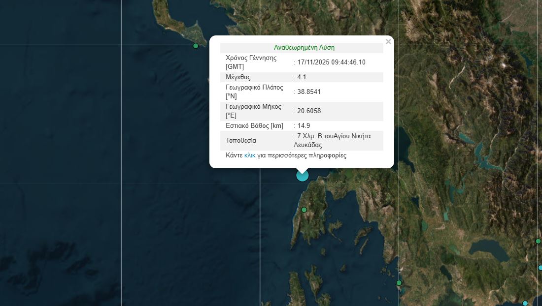 Σεισμός σημειώθηκε το πρωί της Δευτέρας 17/11 ανοιχτά της Λευκάδας. Σύμφωνα με την αναθεωρημένη λύση του Γεωδυναμικού Ινστιτούτου, ο σεισμός ήταν μεγέθους 4,2 βαθμών της κλίμακας Ρίχτερ και είχε επίκεντρο θαλάσσια περιοχή που βρίσκεται 7 χιλιόμετρα βόρεια του Αγίου Νικήτα.