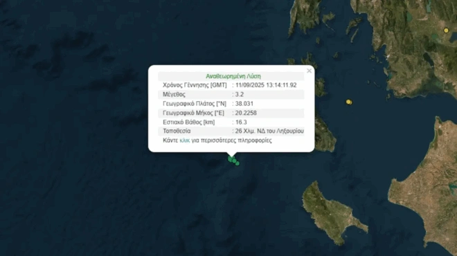 Σεισμός μεγέθους 3,2 βαθμών της κλίμακας Ρίχτερ καταγράφηκε το απόγευμα της Πέμπτης (11/09/2025) στη θαλάσσια περιοχή ανοιχτά της Κεφαλονιάς, προκαλώντας αναστάτωση στους κατοίκους.