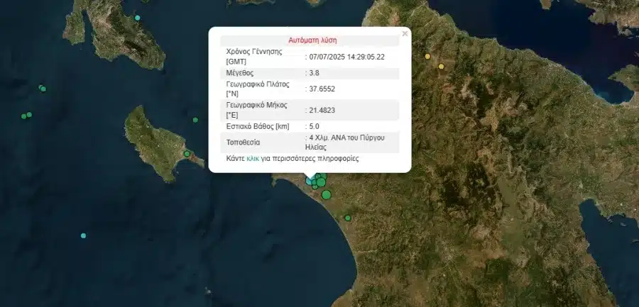 Σεισμός μεγέθους 3,8 Ρίχτερ σημειώθηκε στον Πύργο Ηλείας.