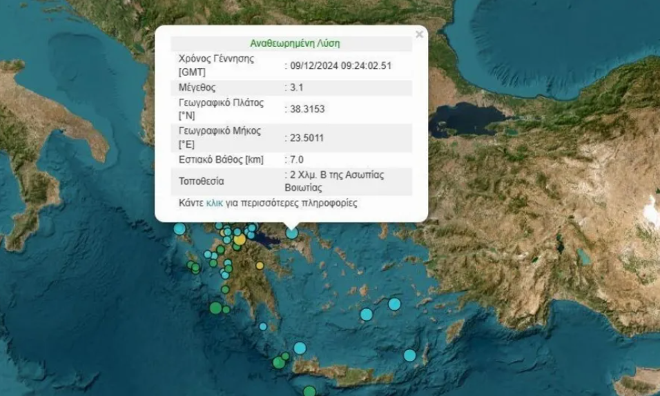 Πιο αναλυτικά να σημειώσουμε πως το πρωί της Δευτέρας 9 Δεκεμβρίου είχαμε σεισμική δόνηση μεγέθους 3,1 βαθμών της Κλίμακας Ρίχτερ στη Βοιωτία χωρίς όμως να προκληθούν ζημιές ή κάτι σοβαρότερο.