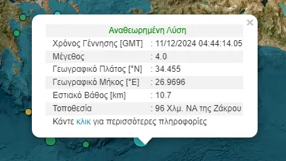 Σεισμός μεγέθους 4 βαθμών της κλίμακας Ρίχτερ, σημειώθηκε νωρίς το πρωί της Τετάρτης (11/12) στον θαλάσσιο χώρο νότια της Κρήτης. Σύμφωνα με τα πρώτα στοιχεία από το Γεωδυναμικό Ινστιτούτο ο σεισμός είχε εστιακό βάθος 10,7 χλμ, ενώ το επίκεντρο τοποθετείται στα 96χλμ νοτιοανατολικά της Ζάκρου.