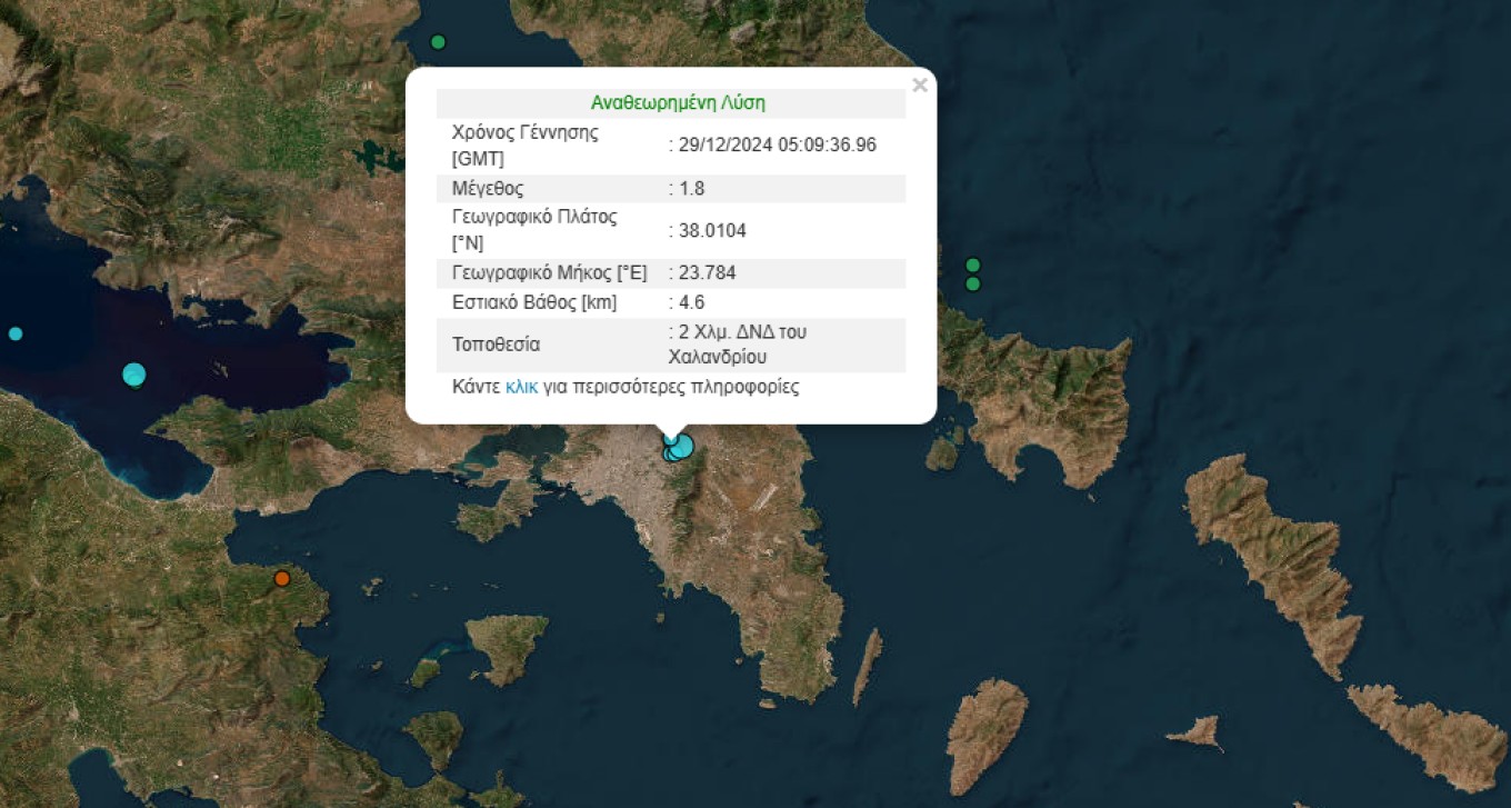 Τρεις ασθενείς, με μικρό εστιακό βάθος δονήσεις, μεγέθους 2,6, 1,9 και 1,8 Ρίχτερ στο Χαλάνδρι μέσα στη νύχτα – Έγιναν αισθητές σε Αγία Παρασκευή, Χολαργό, Παπάγου, Μαρούσι, Αμπελόκηπους, Γαλάτσι, Ζωγράφου, Ψυχικό, Πατήσια και άλλες περιοχές.