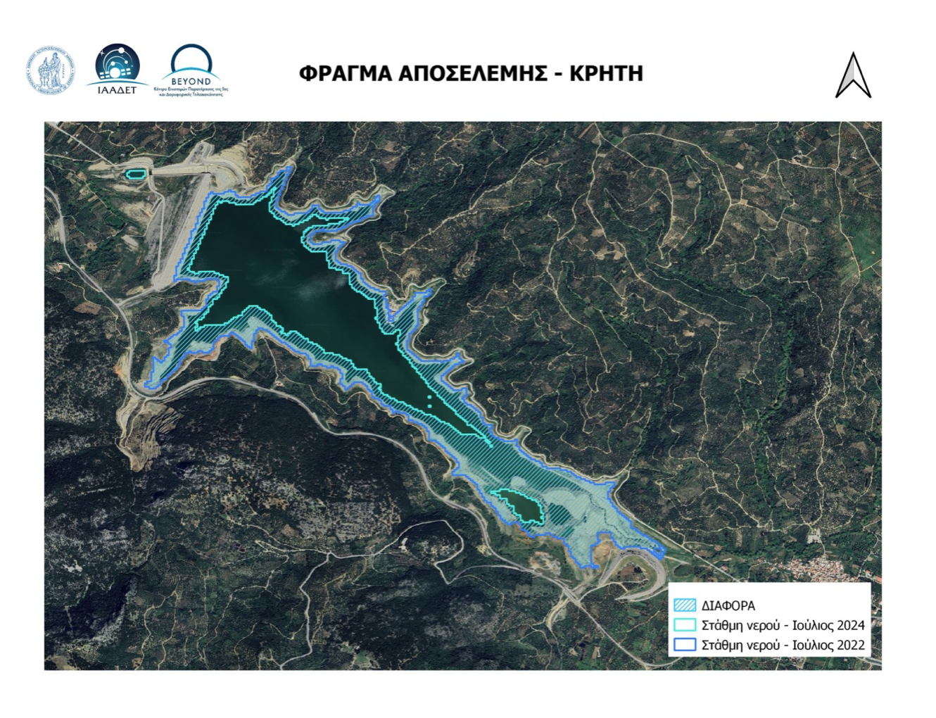 Η ανάλυση δεδομένων αποκάλυψε ότι η στάθμη του νερού στην τεχνητή λίμνη Μόρνου στη Στερεά Ελλάδα και στο φράγμα Αποσελέμη στην Κρήτη έχει μειωθεί σημαντικά σε σύγκριση με το 2022. Οι δορυφορικές εικόνες Sentinel-2 του Beyond EO Centre NOA επιβεβαίωσαν την ανησυχητική αυτή τάση.