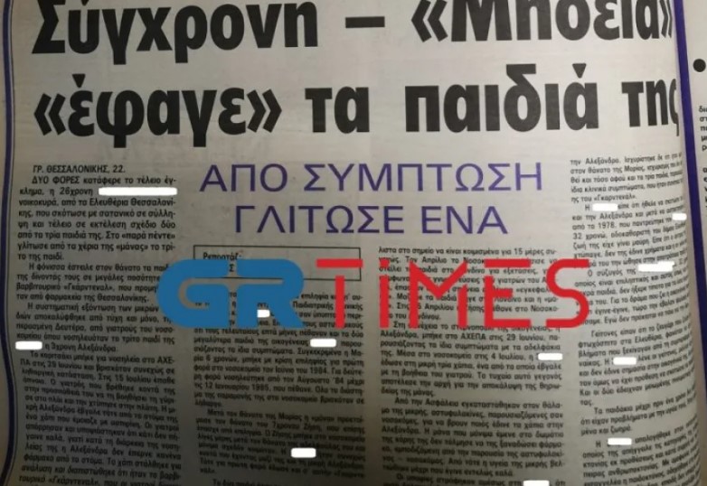 Όπως μεταφέρει το grtimes.gr, το 1985 μια 26χρονη μητέρα στο Ελευθέριο – Κορδελιό, δολοφόνησε τα δύο της παιδιά, ηλικίας 6 και 7 ετών και αποπειράθηκε να κάνει το ίδιο στο τρίτο, μόλις τριών ετών. Οι τίτλοι των εφημερίδων εκείνης της εποχής έκαναν λόγο για μια «σύγχρονη Μήδεια».