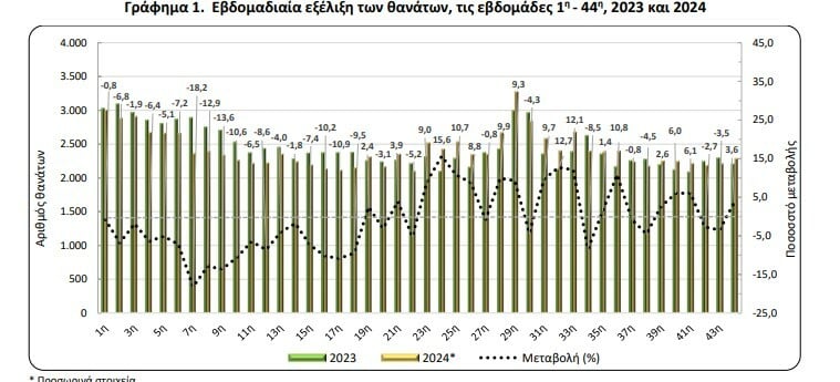 Σε καμία από τις προηγούμενες 21 εβδομάδες οι θάνατοι δεν ξεπέρασαν τους 2.750. Η προηγούμενη εβδομάδα που καταγράφηκαν πάνω από 3.000 θάνατοι ήταν η 31η (αρχές Αυγούστου).