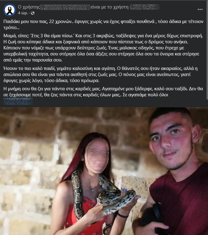 Η τραγική είδηση του θανάτου του Παναγιώτη σκόρπισε θλίψη, ενώ η ανάρτηση της ξαδέλφης του στο διαδίκτυο συγκλόνισε το κοινό. Με λόγια γεμάτα πόνο, η ξαδέλφη του ανέφερε: «Παιδάκι μου που πας, 22 χρονών.. έφυγες χωρίς να έχεις φταίξει πουθενά, τόσο άδικα με τέτοιον τρόπο… Μαμά, είπες: ‘Στις 3 θα είμαι πίσω.’ Και στις 3 ακριβώς, ταξίδεψες για ένα μέρος δίχως επιστροφή». Η ανάρτηση αυτή εκφράζει την ανείπωτη θλίψη των κοντινών του ανθρώπων για την ξαφνική απώλεια.