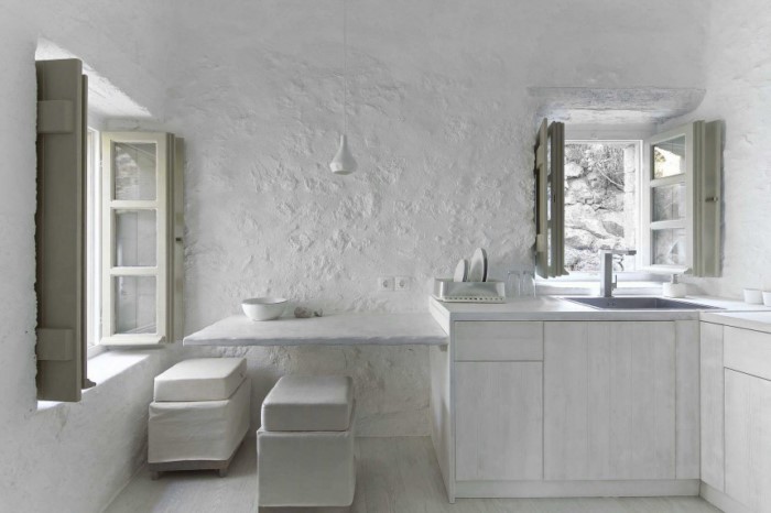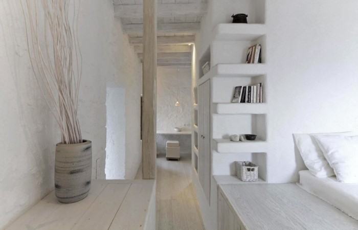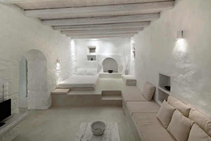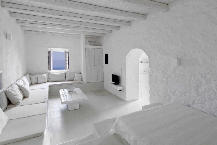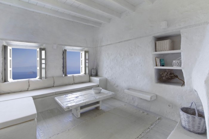 Το μοναδικό σε καθαρότητα και λάμψη φυσικό φως που διεισδύει στο εσωτερικό από τα μικρά παράθυρα ζωντανεύει το ανάγλυφο των λευκών χώρων και δημιουργεί μια ήρεμη μαγευτική ατμόσφαιρα.
