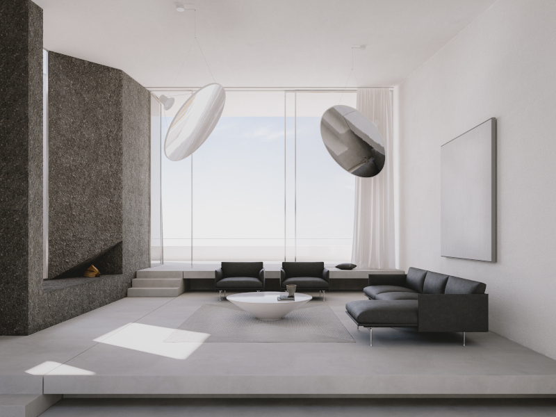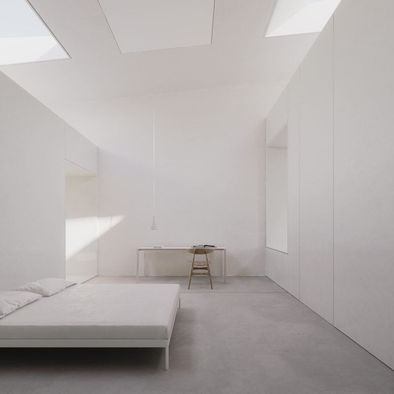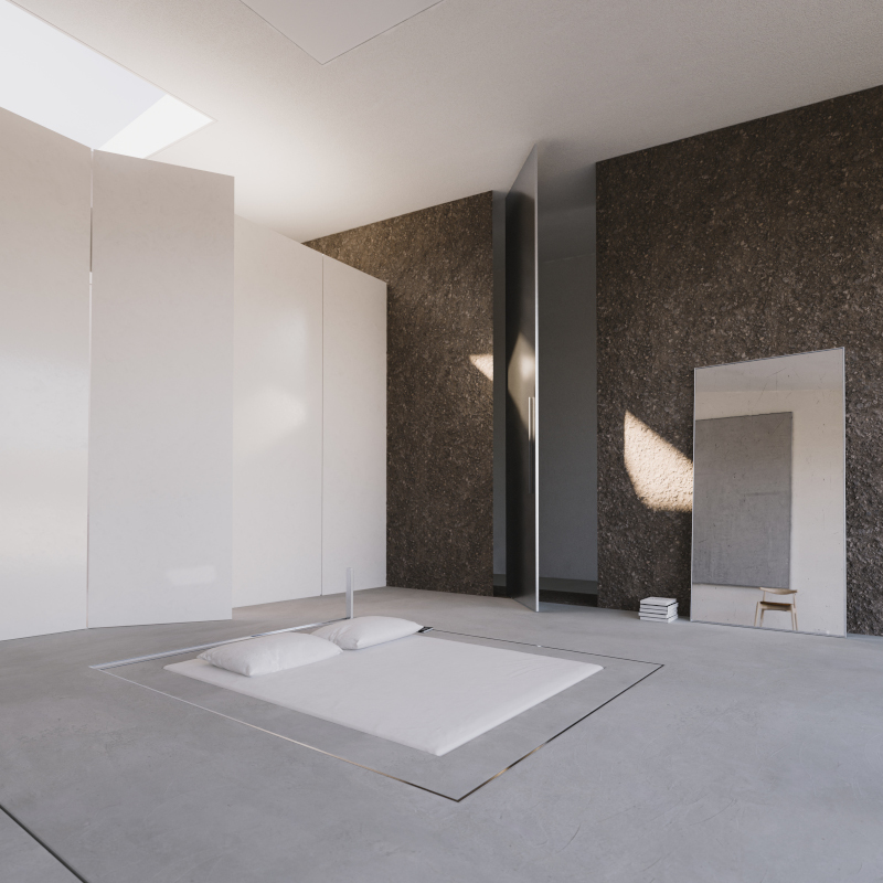 Προκειμένου να εντείνουμε αυτή την αντίθεση μεταξύ ιδιωτικών – κοινόχρηστων χώρων προτείναμε τη βύθιση των ιδιωτικών χώρων ως μια νοητή μεταφορά του ότι γίνεσαι ένα με τη γη. Αυτός είναι ένας από τους λόγους για τον οποίο το κρεβάτι του ενός υπνοδωματίου είναι βυθισμένο στο πάτωμα και δεν αναδύεται», δηλώνει το αρχιτεκτονικό γραφείο, εξηγώντας: «Το βύθισμα στο έδαφος φυσικά δεν είναι αισθητό από το υπνοδωμάτιο, αντιθέτως, δημιουργείται η εντύπωση ότι το δωμάτιο είναι ισόγειο, καθώς ο εξωτερικός χώρος του υπνοδωματίου έχει διαμορφωθεί με κατάλληλες κλίσεις ώστε να δημιουργεί αυτή την ψευδαίσθηση».