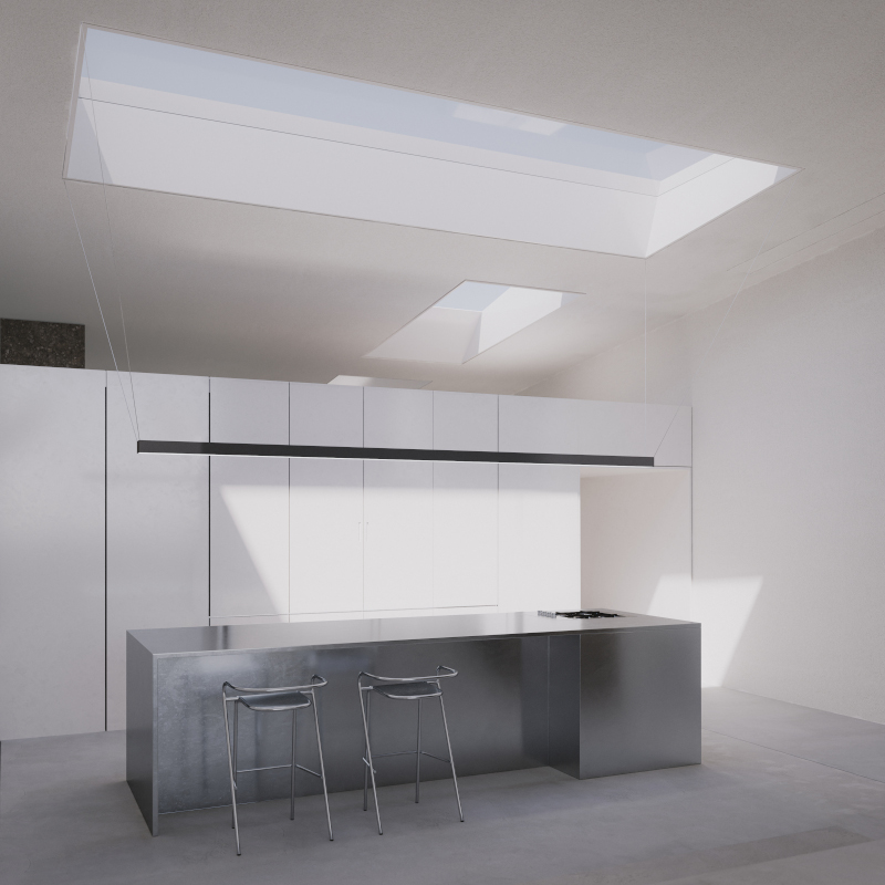 «Η πρόταση μας περιλαμβάνει τη “διάτρηση” της στέγης με την προσθήκη τεσσάρων πολύ μεγάλων ανοιγόμενων φεγγιτών. Οι κλειστοί χώροι που περικλείουν τις ιδιωτικές χρήσεις, δεν “αγγίζουν” το ταβάνι, ενώ το πάνω μέρος τους είναι είτε από τζάμι είτε είναι τελείως ανοιχτοί. Επίσης, σε περίπτωση που τυχόν απαιτηθεί, έχει προβλεφθεί σύστημα τεχνητού εξαερισμού σε όλη την κατοικία. Μέσω της παραπάνω λύσης, όλη η κατοικία δέχεται φυσικό φωτισμό καθ’όλη τη διάρκεια της ημέρας, ενώ παράλληλα έχει επαρκή αερισμό. Τα ανοίγματα στην οροφή προσφέρουν, ταυτόχρονα, μία πρωτόγνωρη εμπειρία φωτισμού, καθώς ως επί των πλείστων έχουμε συνηθίσει το φωτισμό που “μπαίνει” από πλαϊνά ανοίγματα».