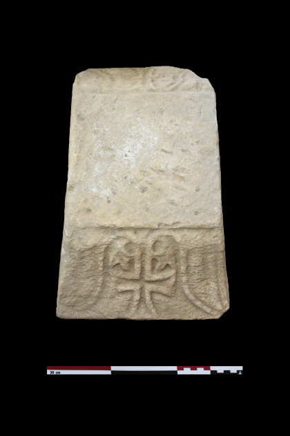 «Στο νότιο ανώτερο πλάτωμα της νησίδας αποκαλύφθηκε μνημειώδες ανάλημμα, μήκους σχεδόν 22 μέτρων. Προσωρινά μπορεί να χρονολογηθεί στους κλασικούς χρόνους. Τόσο από την ισόδομη τοιχοποιία του, όσο και από την κεραμεική που συλλέχθηκε εντός του στρώματος ‘λατύπης’ που συνδέεται με την κατασκευή του. Τα ευρήματα είναι εξαιρετικής ποιότητας κεραμεική των Γεωμετρικών και αρχαϊκών χρόνων.