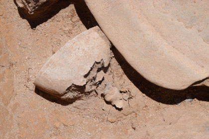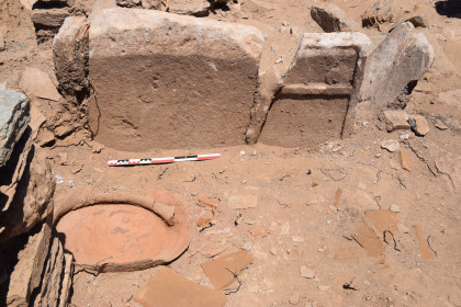 Ορισμένα ευρήματα αναμφίβολα αναθηματικού χαρακτήρα (μικρογραφικά αγγεία, πήλινα γυναικεία ειδώλια, κ.ά.). Σε απόσταση 5 μέτρων ανατολικά του αναλήμματος, ο λαξευμένος βράχος σχηματίζει ορθογώνιο έξαρμα διαστάσεων 11×4 μ. περίπου. Εξαιρετικά διαβρωμένο σήμερα, το οποίο φαίνεται ότι ταυτίζεται με μνημειώδη βωμό. Το ανάλημμα σχηματίζει ένα είδος κρηπίδας ύψους 4,50 μ., δυτικά του οποίου ο φυσικός βράχος σχηματίζει ένα ευρύχωρο άνδηρο με πολυάριθμα ίχνη από αρχαία λαξεύματα, ορισμένα από τα οποία φαίνεται ότι σχετίζονται με κάποιο μνημειώδη ναό που προφανώς είχε ιδρυθεί εδώ. Η προσεκτική μελέτη των λαξευμάτων αυτών ίσως επιτρέψει να αποσαφηνιστεί ως έναν βαθμό η μορφή του κλασικού-ελληνιστικού ναού. Η ταυτότητα της λατρευόμενης θεότητας παραμένει άγνωστη προς το παρόν».
