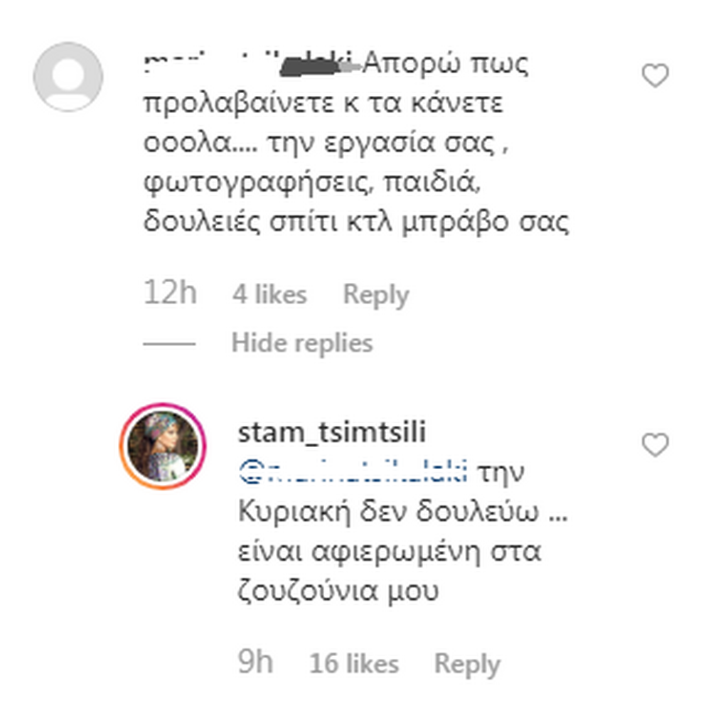 Χιλιάδες ήταν τα likes και τα σχόλια. Υπήρξαν και ορισμένα πιο επικριτικά τα οποία η Σταματίνα Τσιμτσιλή δεν άφησε χωρίς απάντηση.