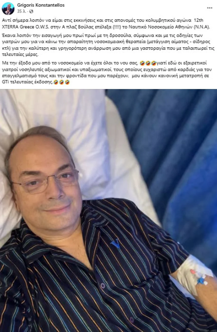 Ο κ. Κωνσταντέλλος υποβλήθηκε σε προγραμματισμένη εισαγωγή για την απαραίτητη νοσοκομειακή θεραπεία, η οποία περιλαμβάνει μετάγγιση αίματος και ενίσχυση με σίδηρο, σύμφωνα με τις οδηγίες των θεραπόντων ιατρών.