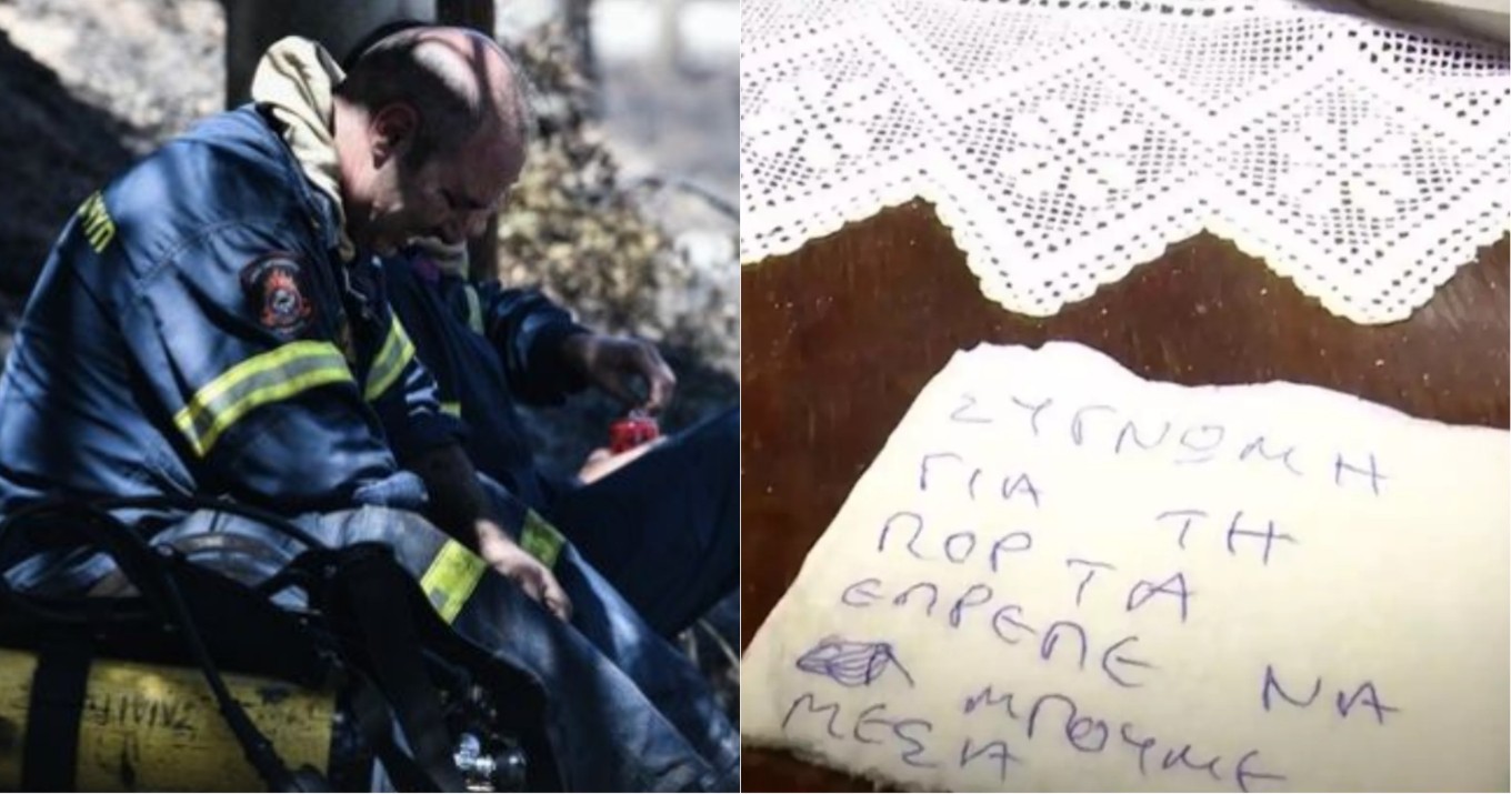 Όταν τελικά η φωτιά έσβησε, οι δυο πυροσβέστες αγκάλιασαν τον ιδιοκτήτη λέγοντάς του πως του έχουν αφήσει κάτι στο εσωτερικό. Όπως βλέπουμε από την εικόνα που κατέγραψε η κάμερα του OPEN, οι δύο πυροσβέστες έγραψαν πάνω σε μία χαρτοπετσέτα: «Συγγνώμη για την πόρτα. Έπρεπε να μπούμε μέσα».