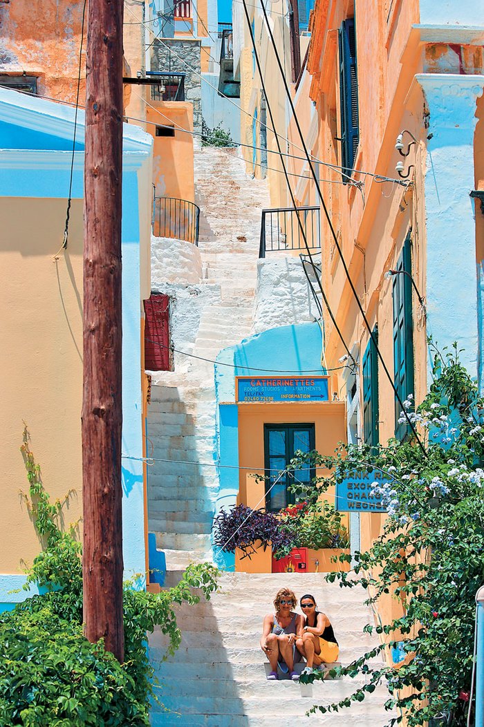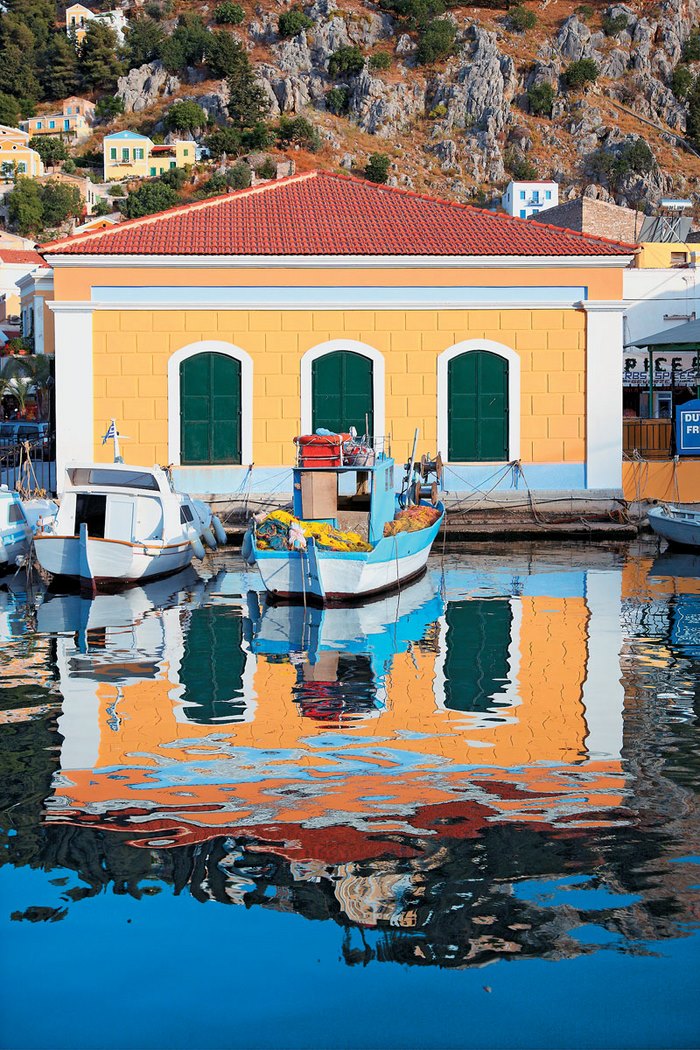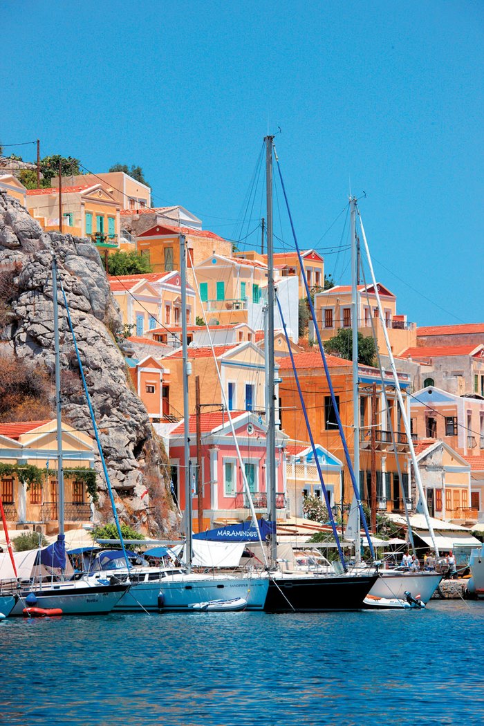 Νεοκλασικά σπίτια βαμμένα σε έντονα, ζεστά χρώματα σκαρφαλωμένα στα πετρώδη απότομα βουνά του νησιού, αντανακλούν το ένδοξο παρελθόν της Σύμης, με παράδοση στη σπογγαλιεία, τη ναυπηγική και την ξυλογλυπτική.