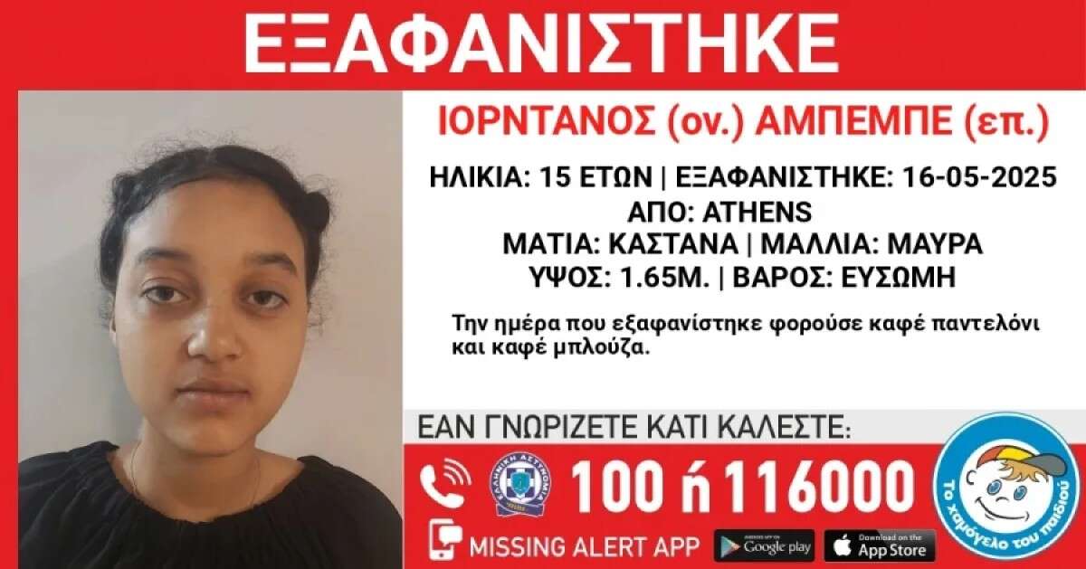 Στις 16/05/2025 και ώρα 12:00 μ.μ. εξαφανίστηκε από χώρο φιλοξενίας στην περιοχή της Βικτώριας στο κέντρο της Αθήνας η Ιορντάνος- Yordanos (ον.) Αμπέμπε- Abebe (επ.), 15 ετών, με καταγωγή από την Αιθιοπία.