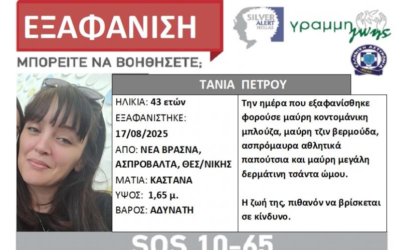 Η Τάνια Πέτρου, 43 ετών, εξαφανίστηκε στην περιοχή των Νέων Βρασνών, στην Ασπροβάλτα Θεσσαλονίκης, το βράδυ της 17/08/2025.