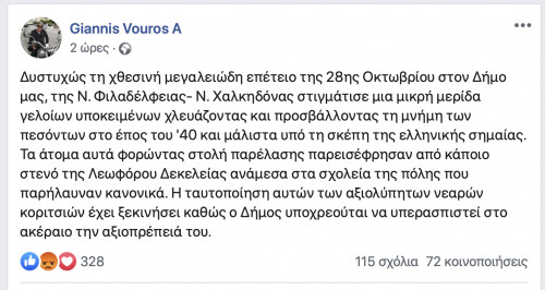 “Δυστυχώς τη χθεσινή μεγαλειώδη επέτειο της 28ης Οκτωβρίου στον Δήμο μας, της Ν. Φιλαδέλφειας- Ν. Χαλκηδόνας στιγμάτισε μια μικρή μερίδα γελοίων υποκειμένων χλευάζοντας και προσβάλλοντας τη μνήμη των πεσόντων στο έπος του ’40 και μάλιστα υπό τη σκέπη της ελληνικής σημαίας.