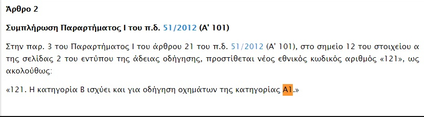 Ανακοίνωση του Υπουργείου Υποδομών και Μεταφορών, διαψεύδει τα εν λόγω δημοσιεύματα. Πιο συγκεκριμένα, η συγκεκριμένη ρύθμιση αφορά μόνο στην προσαρμογή του Πληροφοριακού Συστήματος του Υπουργείου Υποδομών και Μεταφορών, ώστε να υπάρχει η δυνατότητα συμπλήρωσης του εντύπου των αδειών οδήγησης. Επιπροσθέτως, καθίσταται σαφές πως δεν αλλάζει το ισχύον νομικό πλαίσιο σχετικά με τις άδειες οδήγησης και ως εκ τούτου δεν δίνεται αυτόματα το δικαίωμα οδήγησης δικύκλου κατηγορίας Α1 από κάτοχο άδειας οδήγησης κατηγορίας Β.