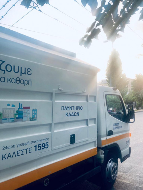 Επτά ειδικά οχήματα -ένα σε κάθε Κοινότητα- με υπερσύγχρονο τεχνολογικό εξοπλισμό βρίσκονται ήδη στους δρόμους της πόλης. Ακολουθούν τα απορριμματοφόρα του Δήμου Αθηναίων, στην διάρκεια της αποκομιδής. Πλένουν με ζεστό νερό και ειδικό καθαριστικό υγρό τους κάδους που μόλις έχουν αδειάσει.