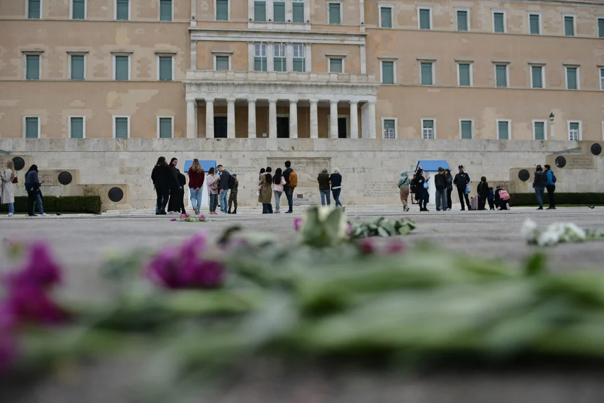 Πιο νωρίς, περαστικοί από το Σύνταγμα, είχαν αφήσει λίγα μωβ και λευκά λουλούδια.