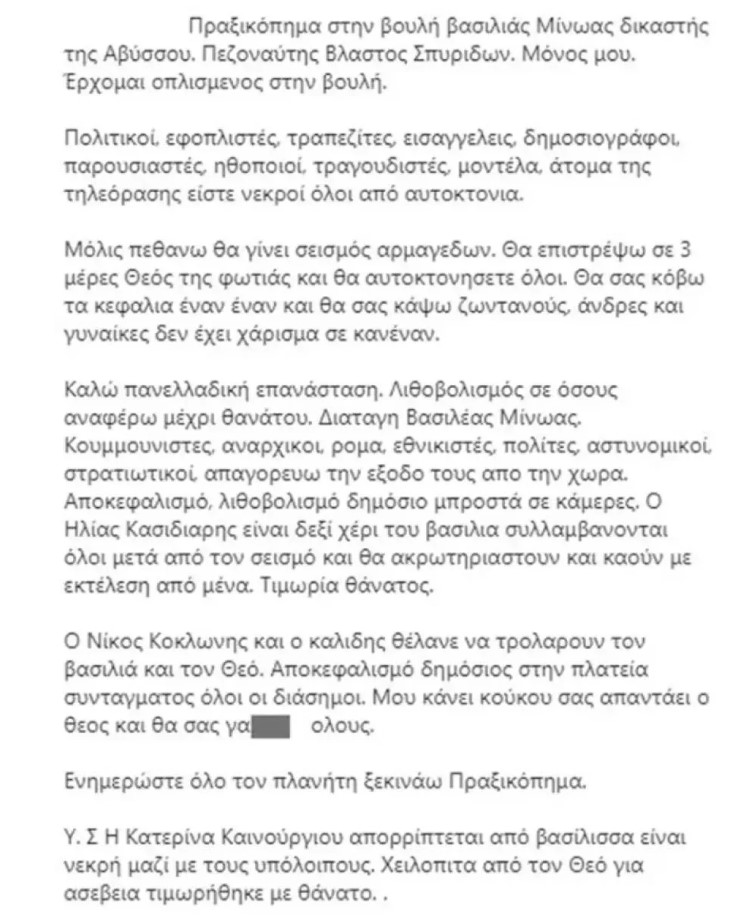 Μόλις πεθάνω θα γίνει σεισμός Αρμαγεδων. Θα επιστρέψω σε 3 μέρες Θεός της φωτιάς και θα αυτοκτονήσετε όλοι. Θα σας κόβω τα κεφάλια έναν έναν και θα σας κάψω ζωντανούς, άνδρες και γυναίκες δεν έχει χάρισμα σε κανέναν. Καλώ πανελλαδική επανάσταση. Λιθοβολισμός σε όσους αναφέρω μέχρι θανάτου. Διαταγή Βασιλέας Μίνωας. Κουμμουνιστές, αναρχικοί, ρομά, εθνικιστές, πολίτες, αστυνομικοί, στρατιωτικοί, απαγορεύω την έξοδο τους από την χώρα. Αποκεφαλισμό, λιθοβολισμό δημόσιο μπροστά σε κάμερες. Ο Ηλίας Κασιδιάρης είναι δεξί χέρι του βασιλιά, συλλαμβάνονται όλοι μετά από τον σεισμό και θα ακρωτηριαστούν και καούν με εκτέλεση από μένα. Τιμωρία θάνατος. Ο Νίκος Κοκλωνης και ο Καλλίδης θέλανε να τρολάρουν τον βασιλιά και τον Θεό. Αποκεφαλισμό δημόσιος στην πλατεία Συντάγματος όλοι οι διάσημοι. Μου κάνει κούκου σας απαντάει ο Θεός και θα σας γ@@@ όλους. Ενημερώστε όλο τον πλανήτη ξεκινάω Πραξικόπημα. Υ. Σ Η Κατερίνα Καινούργιου απορρίπτεται από βασίλισσα είναι νεκρή μαζί με τους υπόλοιπους. Χειλόπιτα από τον Θεό για ασέβεια τιμωρήθηκε με θάνατο».